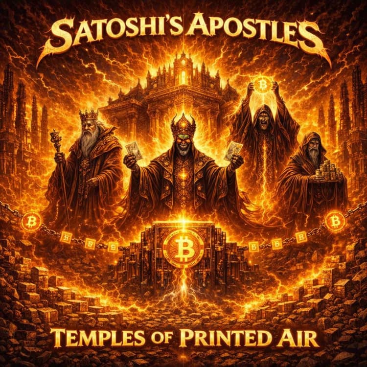 “Temples of Printed Air” is a concept album chronicling the final war between the old fiat priesthood and the rising prophets of the chain. Across ten explosive tracks, the story unfolds through fire, corruption, rebellion, and awakening - from the first whispers in the wires to the ultimate block revolution. With soaring choirs, crushing riffs, and apocalyptic storytelling, the album explores how empires built on debt collapse while truth forged in code and work rises from the ashes. It is a journey through temples of inflation, false gospels, and crumbling crowns - toward a world where value can no longer be forged from nothing. Special thanks to Sigmaximus(https://sigmaximus.npub.pro/) for the album cover art.